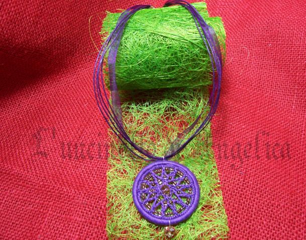 Allora ho preso l'uncinetto, il cotone ed ho iniziato a creare questo ciondolo che ho poi inserito nel girocollo..., quando ho finito ero ancora al telefono..., ma pienamente soddisfatta del mio operato,(a me piace, anche se in foto non si vede benissimo) voi che ne pensate...?